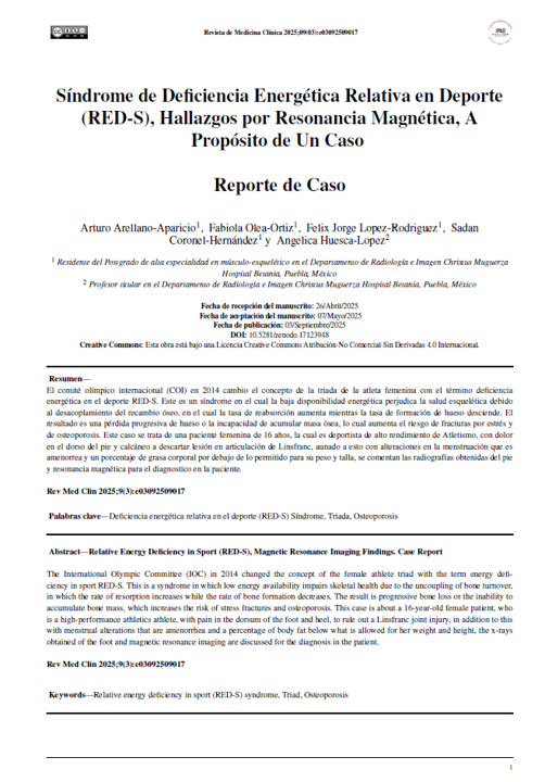 Síndrome de Deficiencia Energética Relativa en Deporte (RED-S), Hallazgos por Resonancia Magnética, A Propósito de Un Caso. Rev Med Clin [Internet]. 2025 Sep. 3 [cited 2026 Jan. 23];9(3):e03092509017. Available from: https://medicinaclinica.org/index.php/rmc/article/view/646