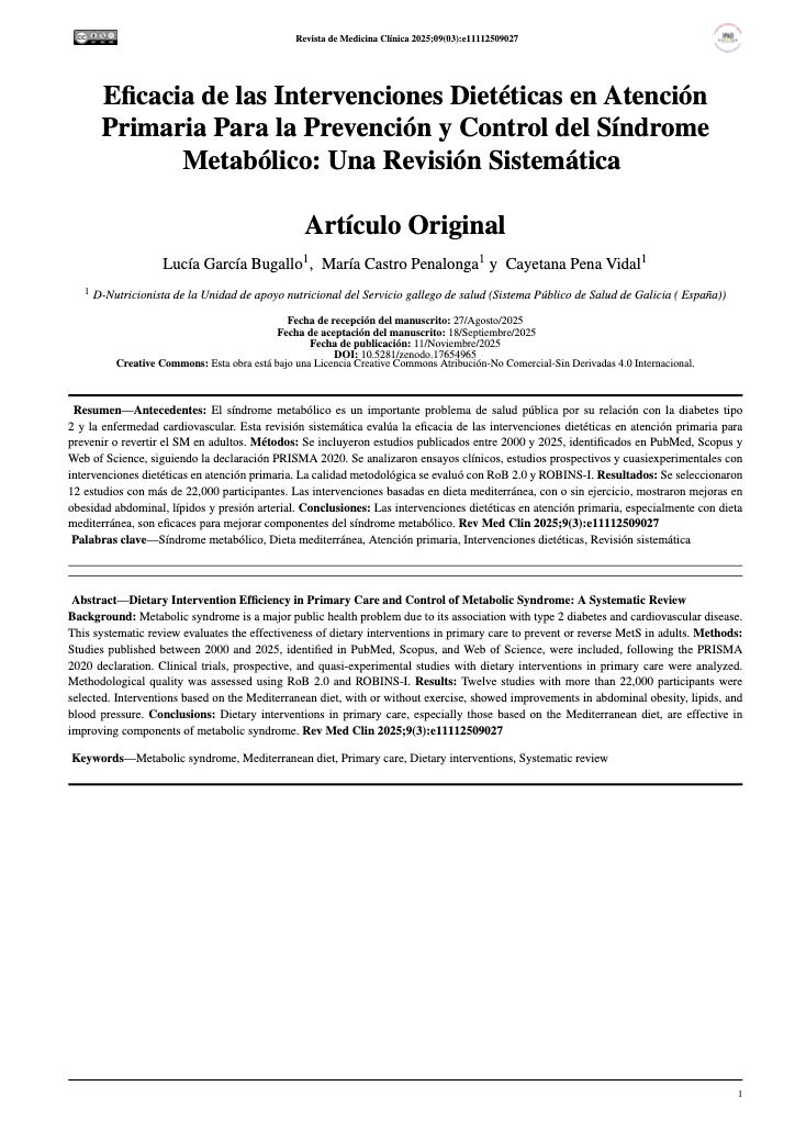 Eficacia de las intervenciones dietéticas en atención primaria para la prevención y control del síndrome metabólico: una revisión sistemática. Rev Med Clin [Internet]. 2025 Nov. 27 [cited 2026 Jan. 20];9(3):e11112509027. Available from: https://medicinaclinica.org/index.php/rmc/article/view/692