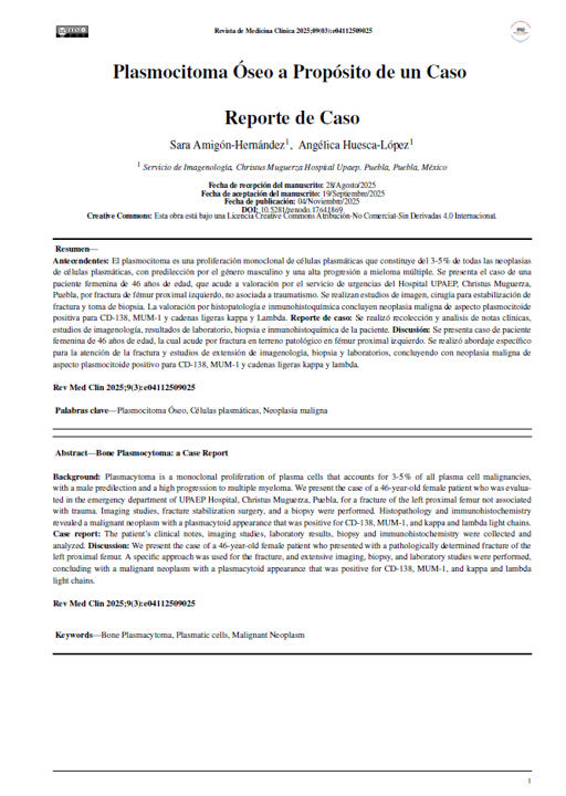 Antecedentes: El plasmocitoma es una proliferación monoclonal de células plasmáticas que constituye del 3-5% de todas las neoplasias de células plasmáticas, con predilección por el género masculino y una alta progresión a mieloma múltiple. Se presenta el caso de una paciente femenina de 46 años de edad, que acude a valoración por el servicio de urgencias del Hospital UPAEP, Christus Muguerza, Puebla, por fractura de fémur proximal izquierdo, no asociada a traumatismo. Se realizan estudios de imagen, cirugía para estabilización de fractura y toma de biopsia. La valoración por histopatología e inmunohistoquímica concluyen neoplasia maligna de aspecto plasmocitoide positiva para CD-138, MUM-1 y cadenas ligeras kappa y Lambda. Reporte de caso: Se realizó recolección y an´´alisis de notas clínicas, estudios de imagenología, resultados de laboratorio, biopsia e inmunohistoquímica de la paciente. Discusión: Se presenta caso de paciente femenina de 46 años de edad, la cual acude por fractura en terreno patológico en fémur proximal izquierdo. Se realizó abordaje específico para la atención de la fractura y estudios de extensión de imagenología, biopsia y laboratorios, concluyendo con neoplasia maligna de aspecto plasmocitoide positivo para CD-138, MUM-1 y cadenas ligeras kappa y lambda.