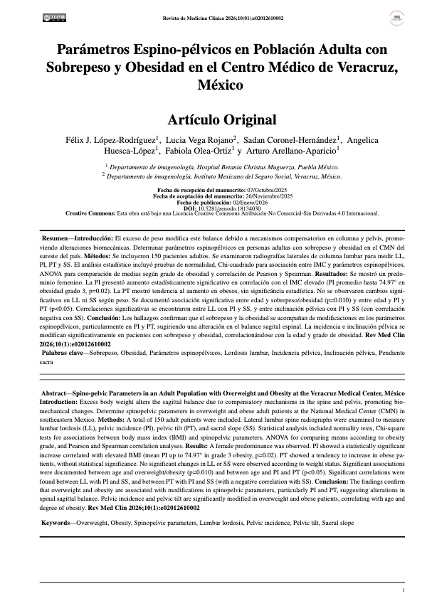 Introduction: Excess body weight alters the sagittal balance due to compensatory mechanisms in the spine and pelvis, promoting biomechanical changes. Determine spinopelvic parameters in overweight and obese adult patients at the National Medical Center (CMN) in southeastern Mexico. Methods: A total of 150 adult patients were included. Lateral lumbar spine radiographs were examined to measure lumbar lordosis (LL), pelvic incidence (PI), pelvic tilt (PT), and sacral slope (SS). Statistical analysis included normality tests, Chi-square tests for associations between body mass index (BMI) and spinopelvic parameters, ANOVA for comparing means according to obesity grade, and Pearson and Spearman correlation analyses. Results: A female predominance was observed. PI showed a statistically significant increase correlated with elevated BMI (mean PI up to 74.97° in grade 3 obesity, p=0.02). PT showed a tendency to increase in obese patients, without statistical significance. No significant changes in LL or SS were observed according to weight status. Significant associations were documented between age and overweight/obesity (p=0.010) and between age and PI and PT (p<0.05). Significant correlations were found between LL with PI and SS, and between PT with PI and SS (with a negative correlation with SS). Conclusion: The findings confirm that overweight and obesity are associated with modifications in spinopelvic parameters, particularly PI and PT, suggesting alterations in spinal sagittal balance. Pelvic incidence and pelvic tilt are significantly modified in overweight and obese patients, correlating with age and degree of obesity.