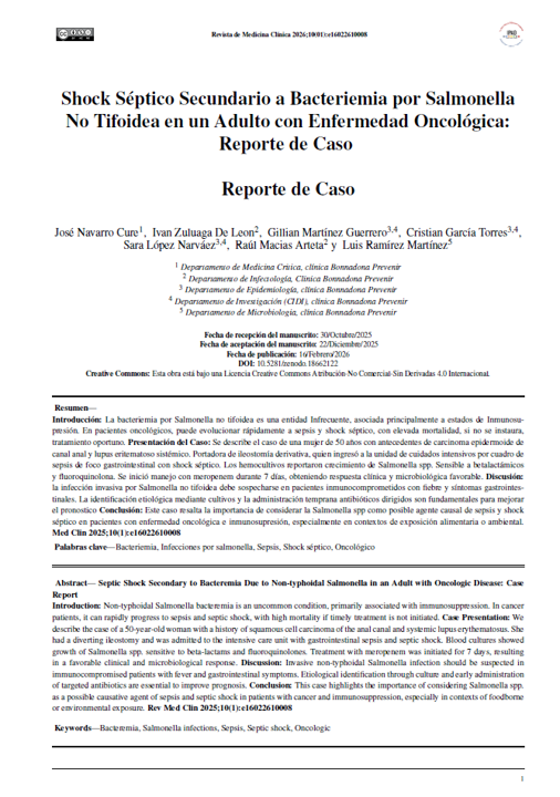 Rodríguez-Chávez LÁ, Romero-Diaz MY, Vargas Machuca-Carranza CA, Vásquez-Tirado GA, Lozano-Araujo VA. Salmonellosis bacteriaemia in an immunocompetent patient, case report and literature review. Medicina Clinica Practica. 2024 Oct 1;7(4).